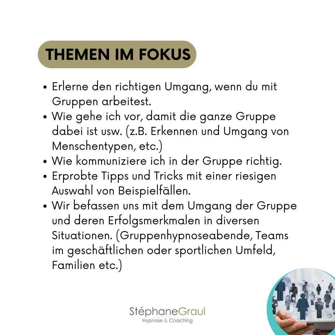 Erlerne den richtigen Umgang, wenn du mit Gruppen arbeitest. Wie gehe ich vor, damit die ganze Gruppe dabei ist usw. (z.B. Erkennen und Umgang von Menschentypen etc.) Wie kommuniziere ich in der Gruppe richtig. Erprobte Tipps und Tricks mit einer riesigen Auswahl von Beispielfällen. Wir befassen uns mit dem Umgang der Gruppe und deren Erfolgsmerkmalen in diversen Situationen. (Gruppenhypnoseabende, Teams im geschäftlichen oder sportlichen Umfeld, Familien etc.)