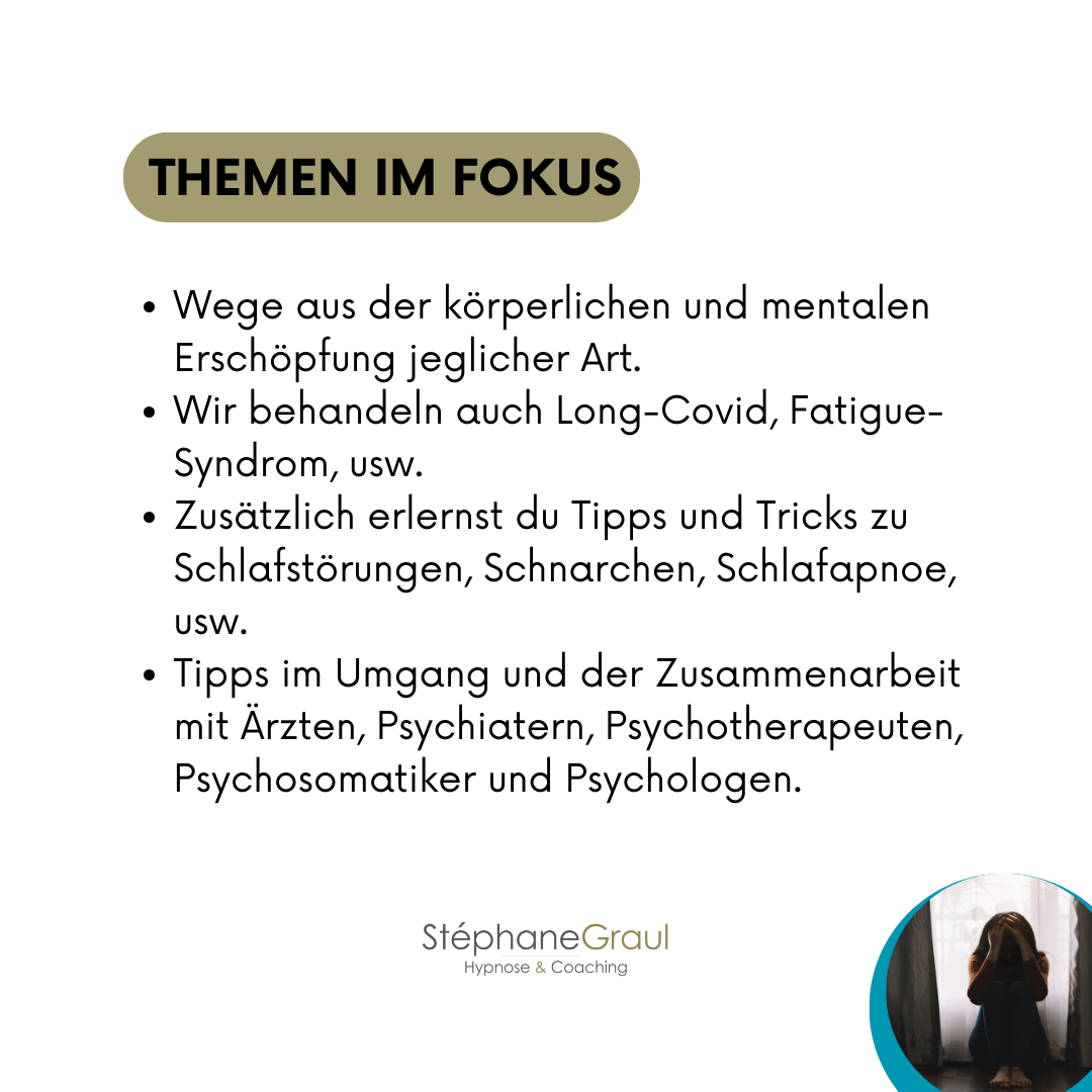 Wege aus der körperlichen und mentalen Erschöpfung jeglicher Art. Wir behandeln auch Long-Covid, Fatigue-Syndrom usw. Zusätzlich erlernst du Tipps und Tricks zu Schlafstörungen, Schnarchen, Schlafapnoe etc. Tipps im Umgang und der Zusammenarbeit mit Ärzten, Psychiatern, Psychotherapeuten, Psychosomatikern und Psychologen.